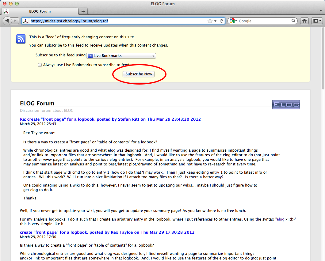 RSS (RDF Site Summrary or Really Simple Syntication) is a web feed format to publish frequently new or updated ELOG entries. This is a bit like the email notifications present in ELOG, but the RSS system does not go through an email reader, but through a dedicated RSS reader. This helps to seperate ELOG updates form other email or spam. An RSS "channel" can be subscribed to, so one gets notified whenever a new or updated entry exists. One can either use a dedicated RSS reader or aggregator, or use the RSS functionality of a web browser, such as Firefox or Google Reader.